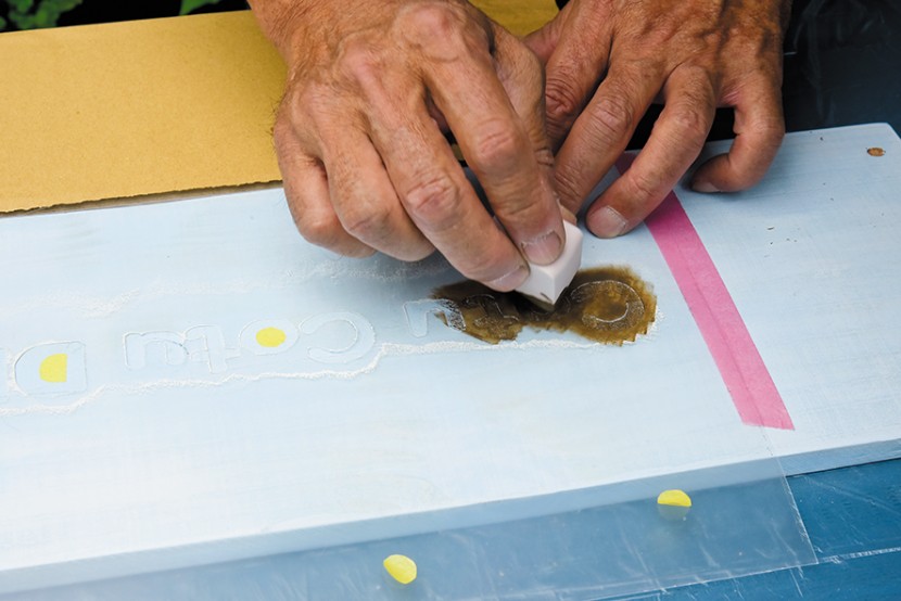 型の上からスポンジで軽くポンポンたたいて色を載せていく。左右にブレず上下方向に動かすことで、にじみをふせぐことができる