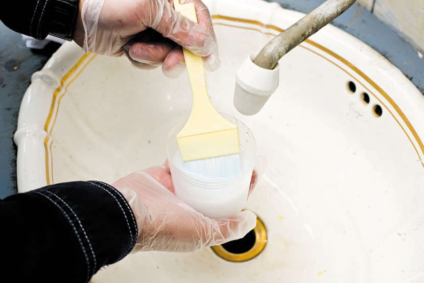 下地の塗料が乾ききらないうちに、ウエスに別の色の塗料(今回はホワイトを使用)を含ませ、端材などにこすってカスカスの状態にしてから、板の角から中央に向かって軽くすり込んでいく。「使っていくとどこが劣化するか」を想像しながら作業するのがコツだ