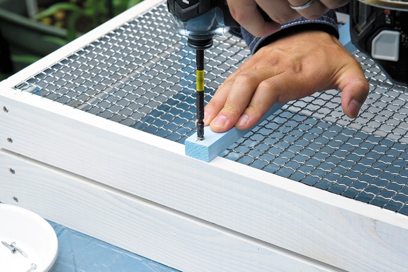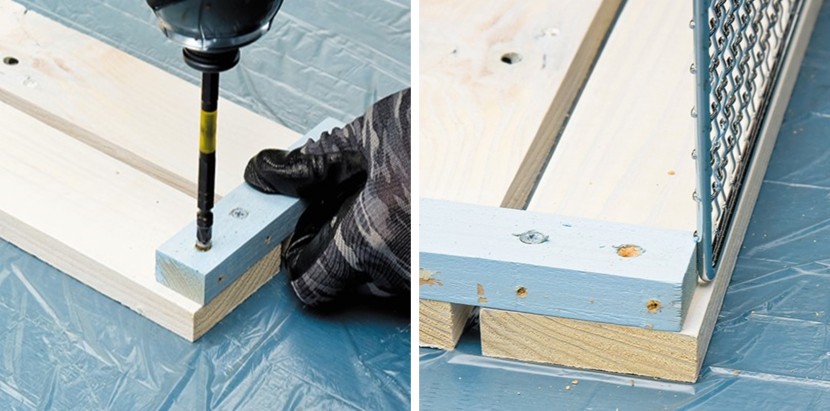 左/ここからはBOXの組み立て。側板Bと補強材Cを固定する 右/側板B同士のすき間は、補強材Cの下側に「金網の厚み」だけ逃げた位置で固定すると自然に決まる