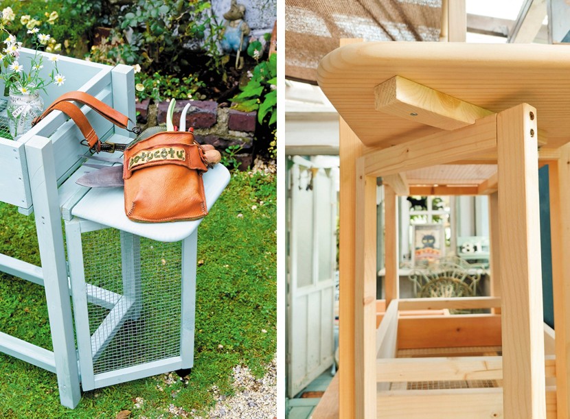 サイドテーブルをつけると、植え替えなどの作業がさらに便利に。折りたたみ式でふだんはコンパクトになるのも魅力だ。天板裏につけた角材の段差で、可動式の脚を固定できる