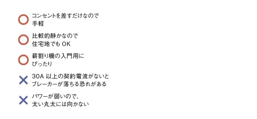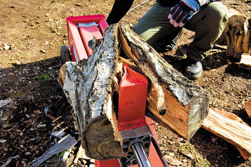 薪割りは多くの人がオノから始めるが、時間的・体力的に余裕がなくなってくると、薪割り機を導入することが少なくない。また、薪割りが好きだからこそ、薪割り機にハマる愛好家もいる。 薪割り機には電動式とエンジン式の2タイプがあり、それぞれに特徴があるので、ライフスタイルに合うものを選んでほしい。新宮商行の野崎さんは、選び方の基準をこう語る。「電動式はコンパクトですが、堅い樹種だとパワー不足になることも。一方、エンジン式は直径45cmほどの丸太でも割れますが、音が大きく、メンテナンスの手間も電動式よりかかります」。初心者が導入しやすいのは電動式といえる。しかし、コンパクトなものはパワーもそれなり。大量に薪を作るなら、ひとつ上の余裕があるクラスを選んだ方がいいだろう。