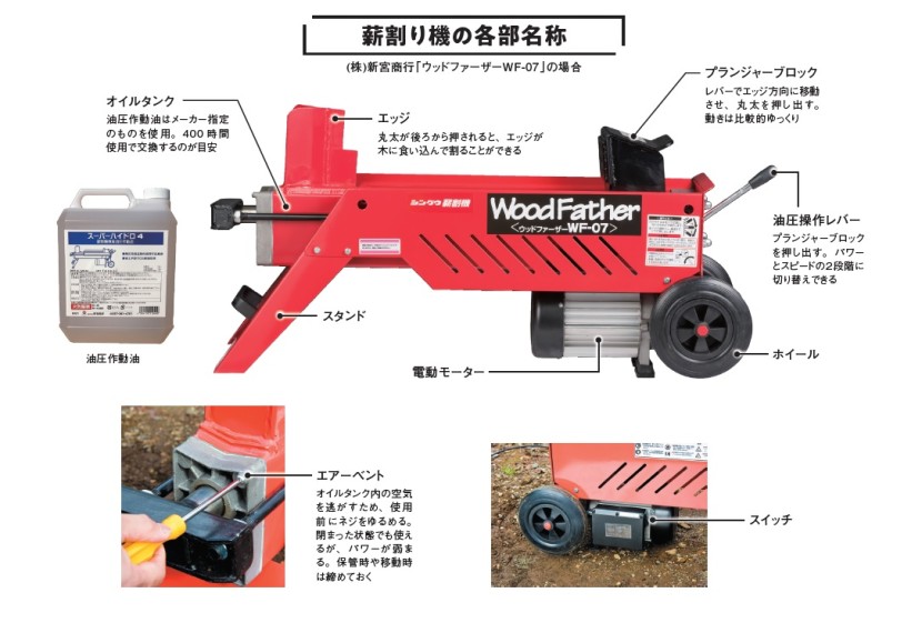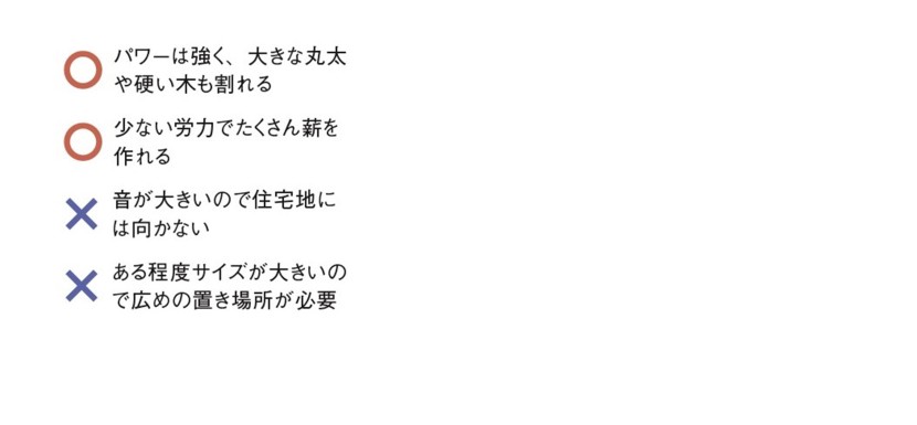 ちなみに、新宮商行では電動式のエッジに2段刃を採用したことにより、従来品よりも丸太を割る力が2倍近くに向上している。非常にパワフルで、電動式だからといってそこまで非力さを心配する必要はなさそうだ。サイズは電動式だと子どもの三輪車程度のものからあり、エンジン式だと小さめの自転車ほど。保管場所との兼ね合いも考慮しよう。