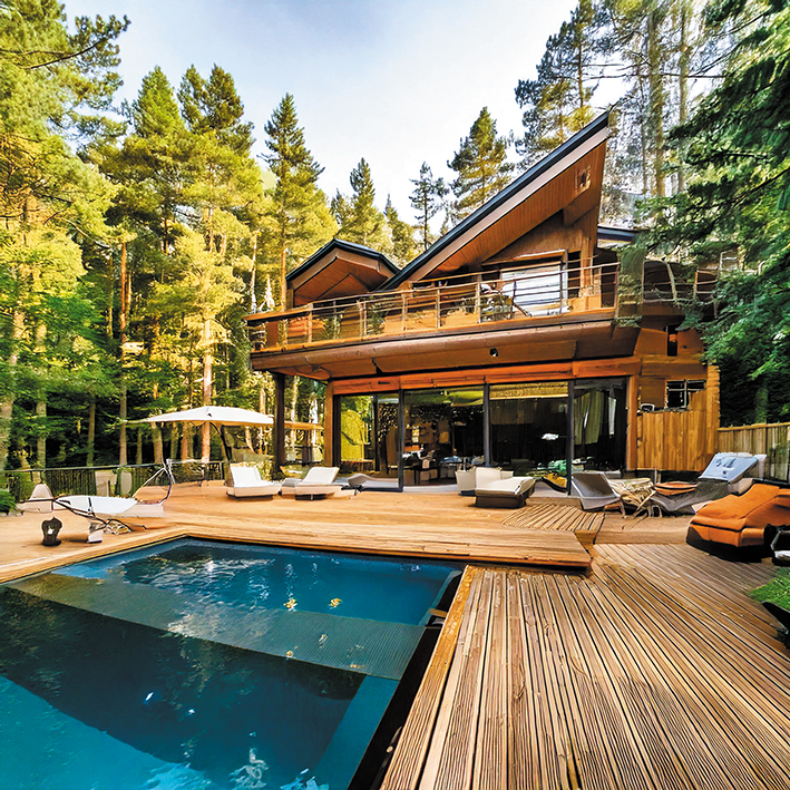 ログハウス本体よりも広いくらいの、どーんと広いウッドデッキがあると、いろいろと楽しそう。ハンモックやパラソル、ソファ、ガーデンキッチン、ジャグジーなどを設置。贅沢だけどプールもあったら子どもが喜びそう。仲間やその家族を呼んで、大勢でワイワイ楽しみたい。ログハウスは、デッキに面した大開口を設けて、コミュニケーションを取りやすくするのが良さそう。都市部だと人目が気になりそうなので、ある程度の郊外がいいけど、高速道路のインターからは近いとうれしいですね。